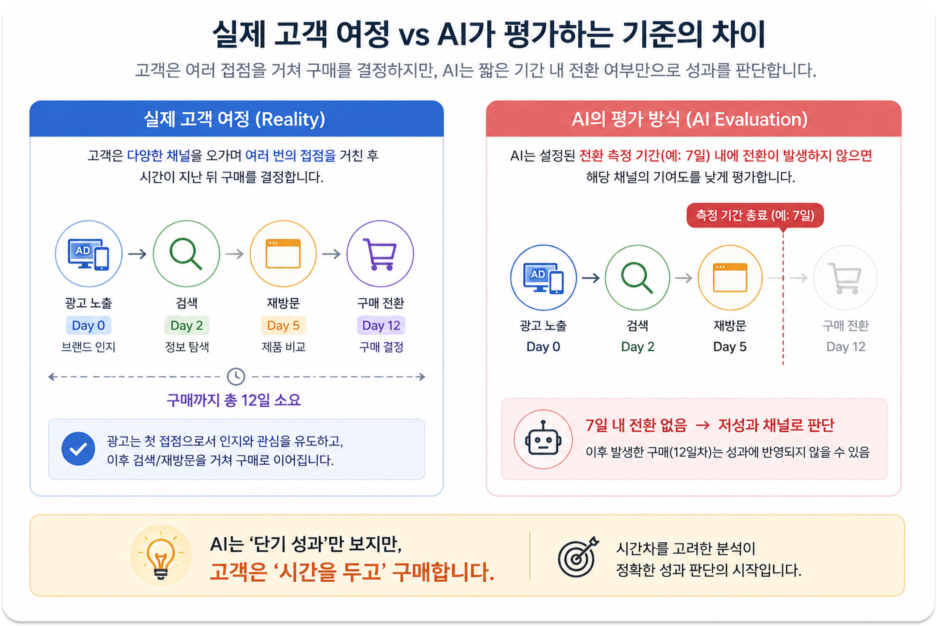 광고 플랫폼의 AI는 전환 데이터를 기반으로 빠르게 최적화되기 때문에, 단기간 내 발생한 성과에 민감하게 반응하는 구조를 가지고 있습니다. 광고 노출 후 일정 기간 내에 전환이 발생하지 않으면 해당 채널의 기여도가 낮게 평가될 수 있죠.