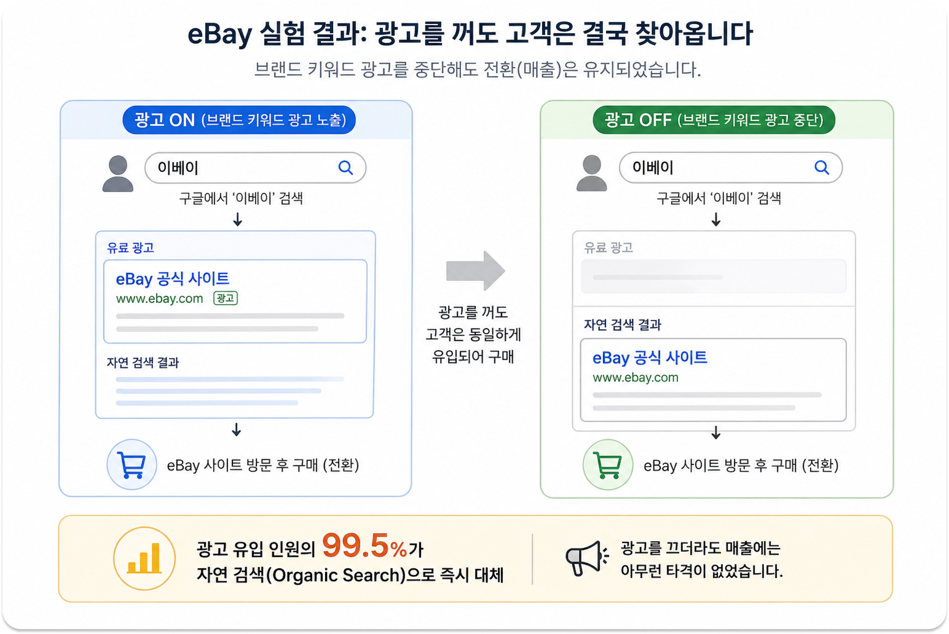 글로벌 기업 이베이(eBay)가 진행했던 유명한 실험이 이를 잘 보여줍니다. 이베이는 당시 구글 검색창에 'eBay'라고 자사 브랜드명을 검색했을 때 나오는 최상단 유료 광고를 전면 중단했습니다. 예를 들어, 소비자가 운동화를 사려고 구글에 '이베이'를 검색하면 평소에는 유료 광고 칸에 떠 있는 이베이 링크를 누르고 들어왔겠지만, 광고를 끄자 그 바로 아래에 있는 일반 검색 결과(자연 검색) 링크를 누르고 들어오기 시작한 것입니다.