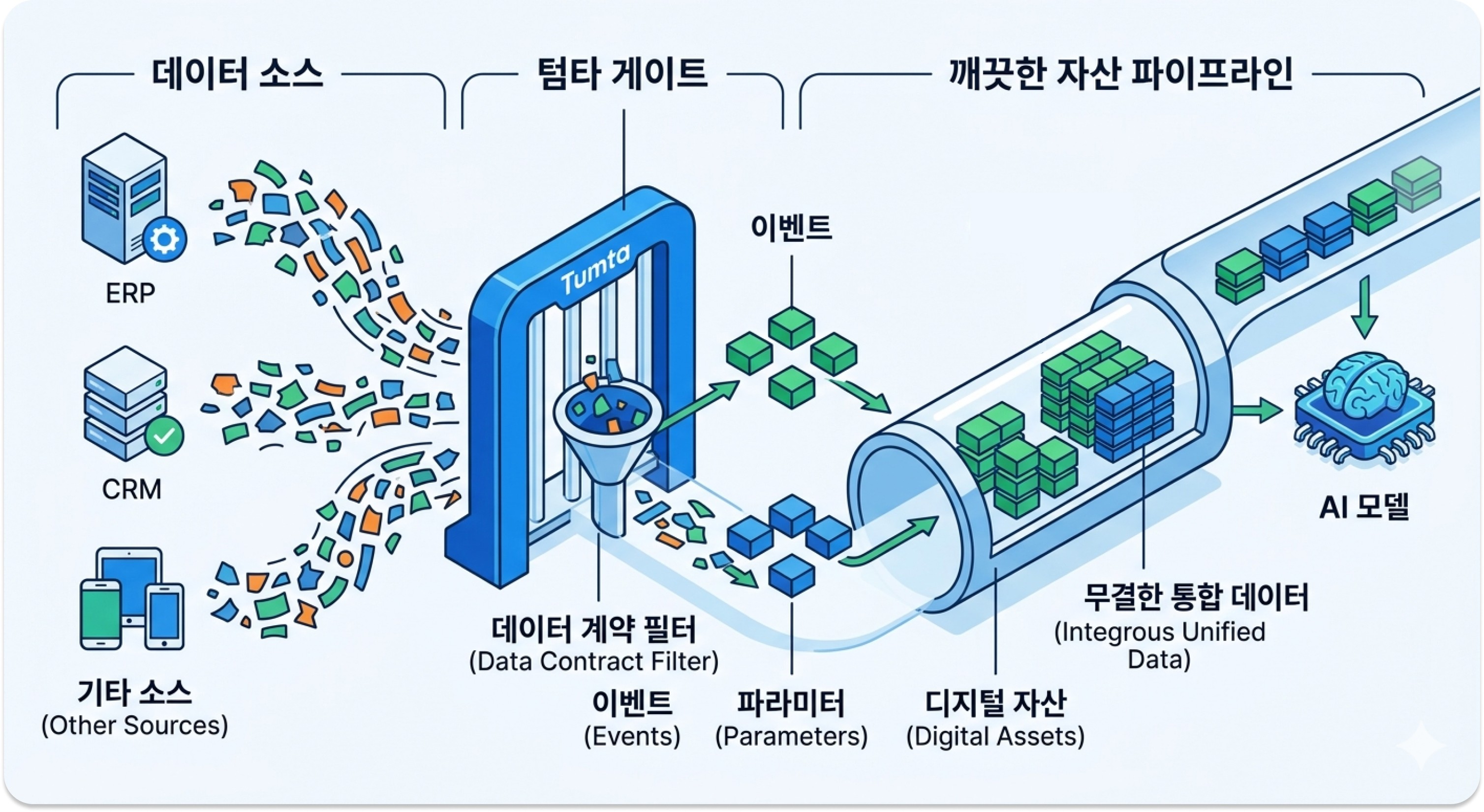 데이터 전문가들이 시간의 80%를 정제 작업에 뺏기는 사이, 시장의 기회는 빠르게 지나갑니다. AI 프로젝트의 높은 실패율은 대개 기술력의 부족이 아니라, 활용할 데이터의 신뢰도가 낮기 때문에 발생합니다. 텀타는 데이터가 흐르는 통로 자체를 처음부터 무결하게 설계하여, 데이터가 쌓이는 즉시 비즈니스에 활용 가능한 '디지털 자산'이 되도록 지원합니다.